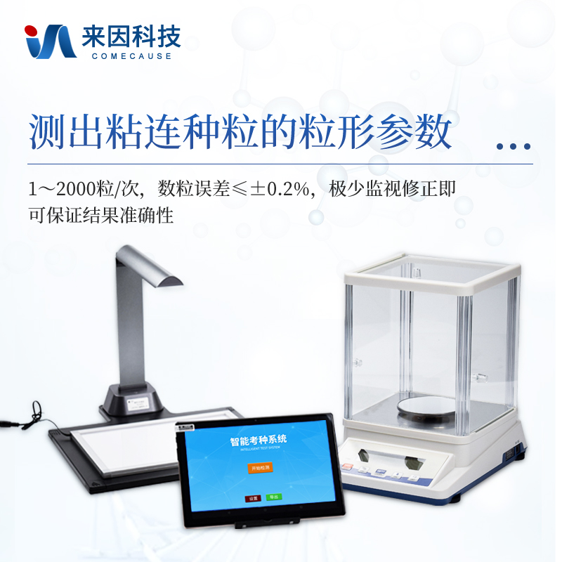 智能考种系统可以测量各种表面光滑的籽粒的数量、千/百粒重与平均粒型(包括长、宽、长宽比、周长、面积),利用图像ORC 识别技术、图像定位、空间转换等技术实现快速识别种子数量及作物性状指标。
