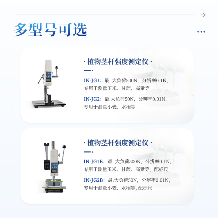 简要描述: 在作物生长的各个阶段对其茎秆进行活体测量,进而根据茎杆纤维层的抗弯阻力与抗倒伏能力的相关性对群体测量数据进行统计处理,对作物的栽培和育种具有重要意义。植物茎秆强度仪采用拉压力传感器,通过针刺、压碎、折断的方式测出茎秆断裂或者屈服瞬间产生的最大力,即茎秆的强度。